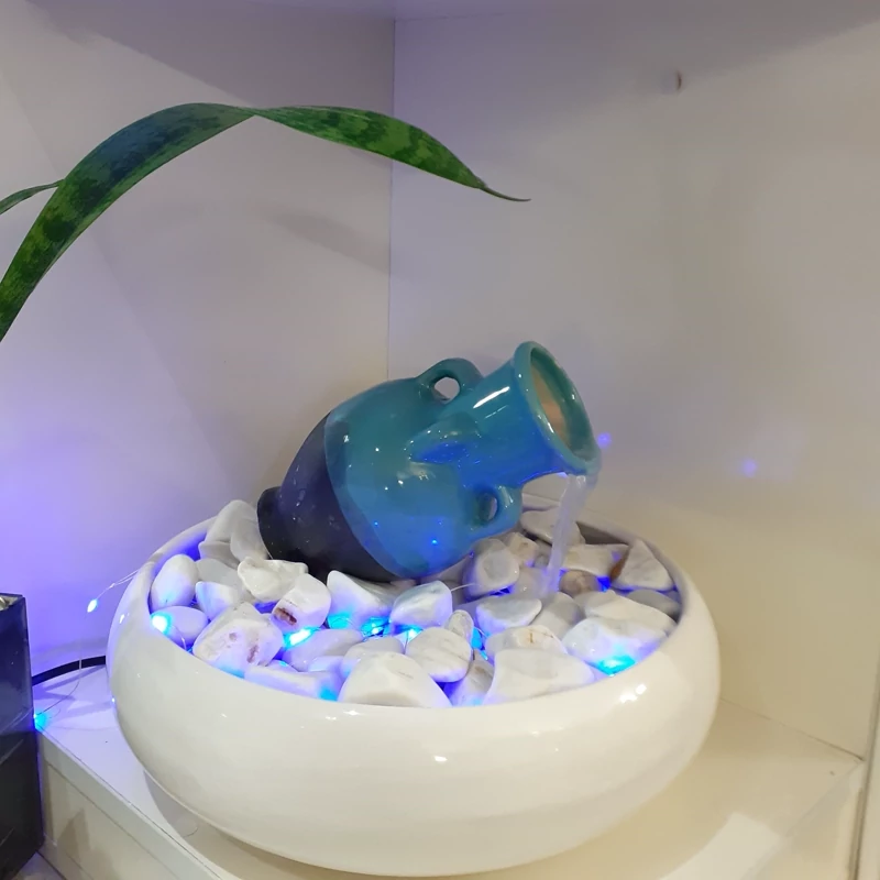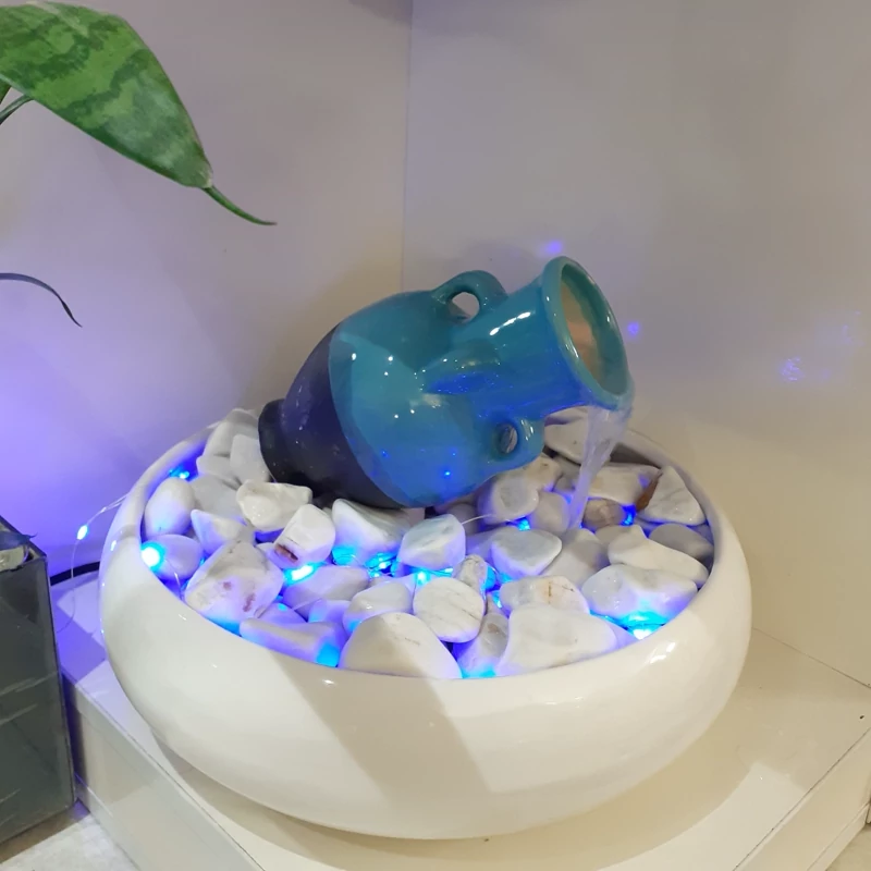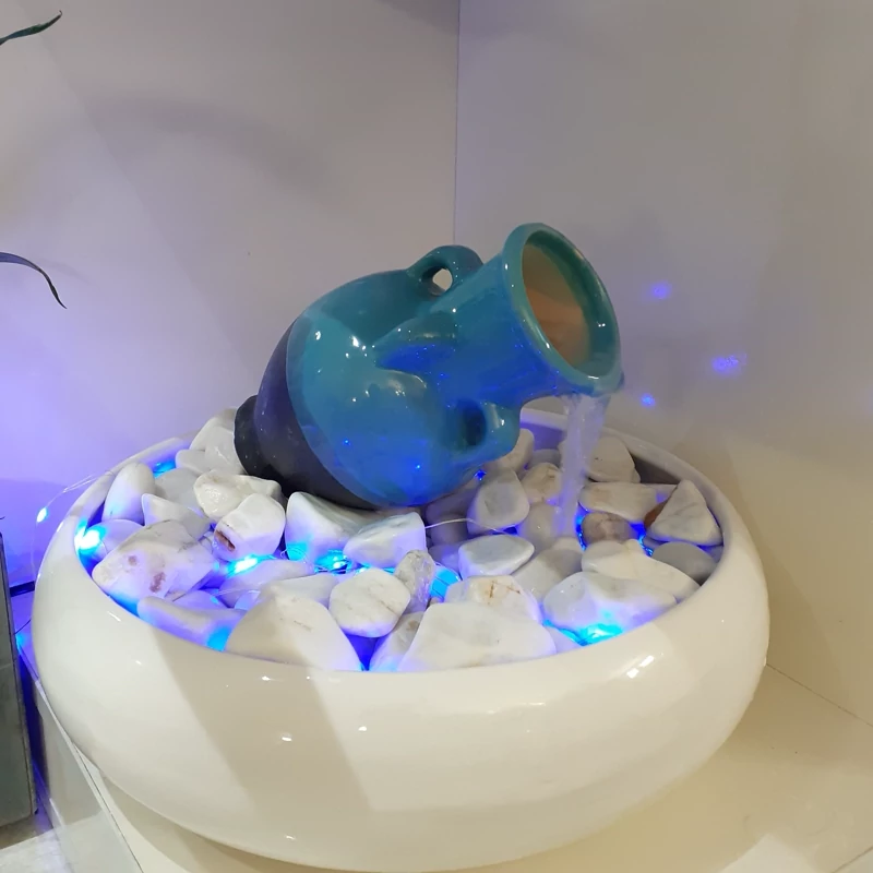 تولید کننده آبنما رومیزی فنگشویی .دارای پمپ آب باکیفیت دارای نور داخل کار.سنگ داخل کار مرمر سفید طبیعی.قطر ظرف 25سانت. جنس ظرف سرامیکی احتیاجی به لوله کشی اب ندارد. قابلیت جابجایی