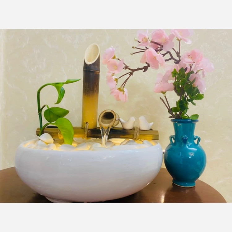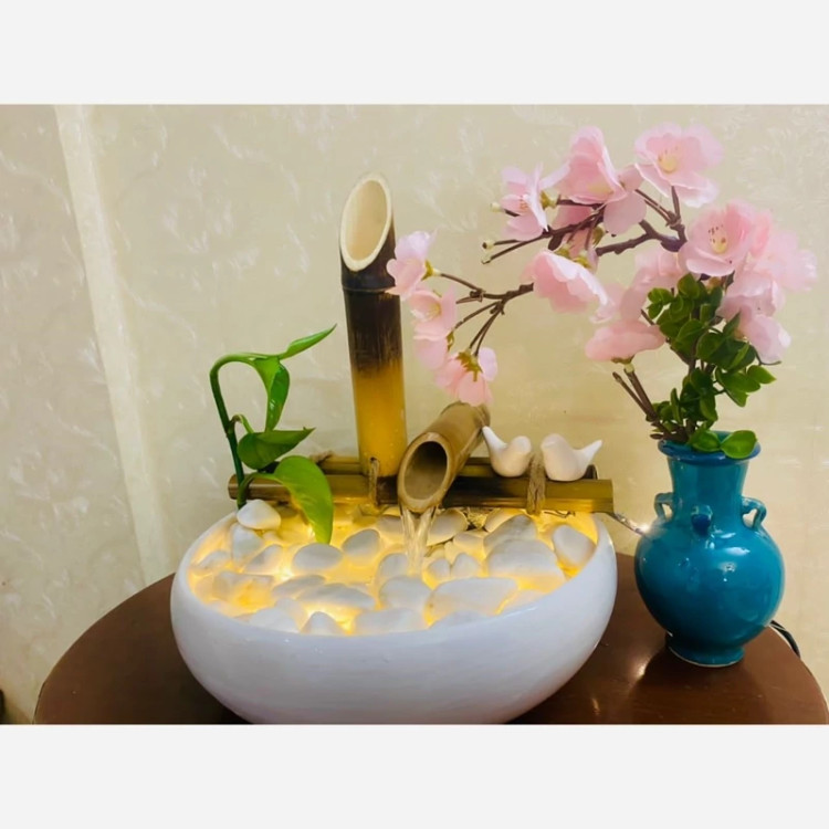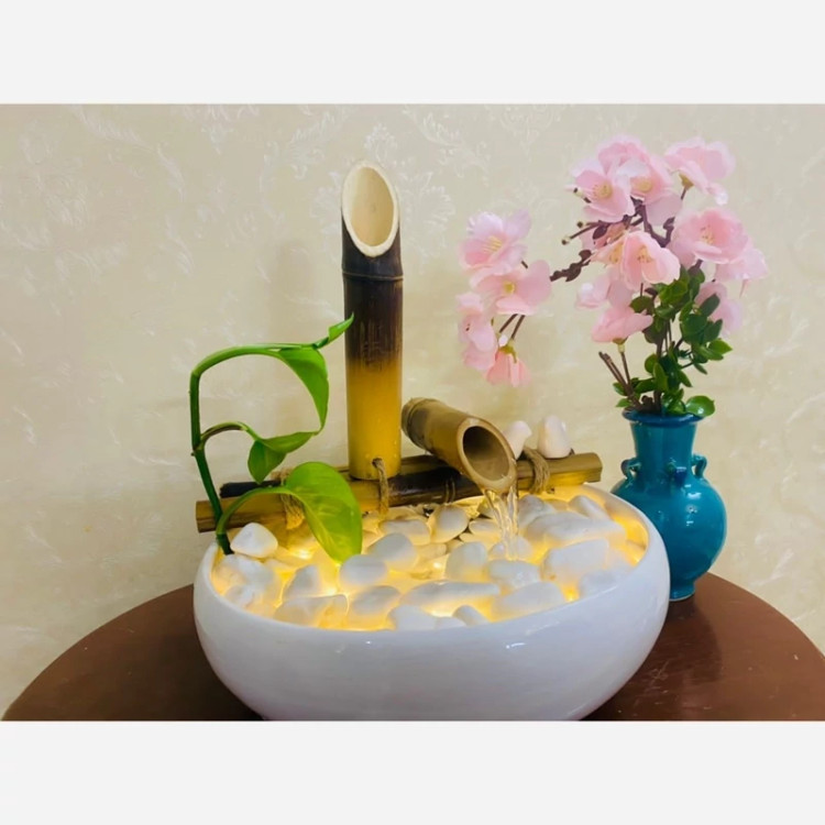 دارای پمپ اب با کیفیت و دایمی دارای نور داری سنگریزه مرمر طبیعی قطر ظرف 25سانت کارها فیکس هستتد هم به ظرف هم ساختار بامبویی
