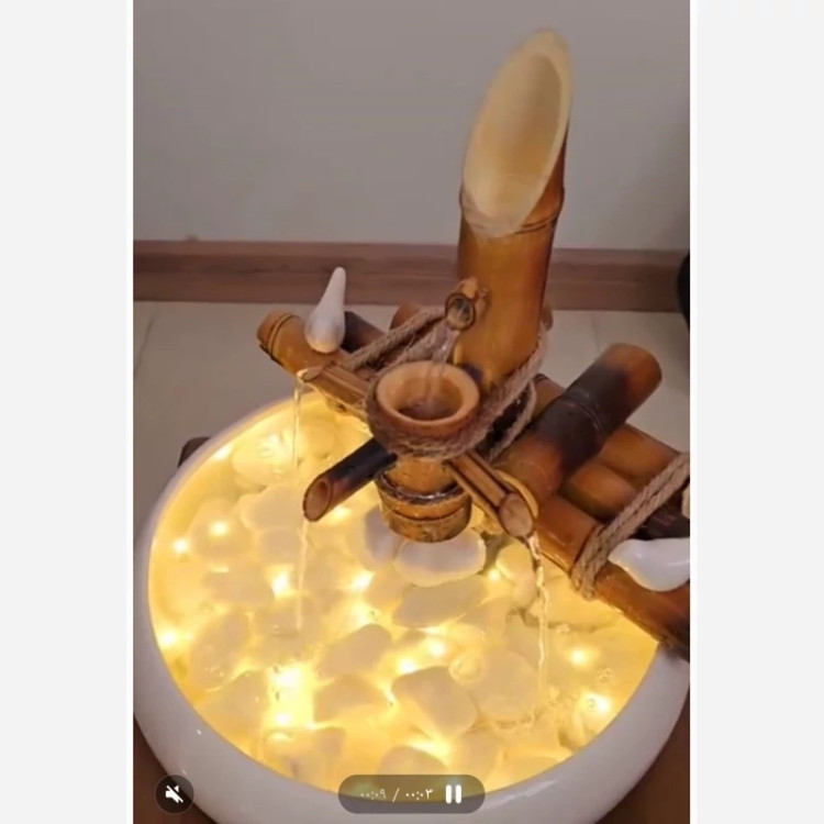 دارای پمپ اب با کیفیت و دایمی دارای نور دارای سنگریزه قطر ظرف 30سانت کاملا دست ساز و ساختار بامبویی فیکس هستند و از بامبو اصل سوالی بود در خدمتم