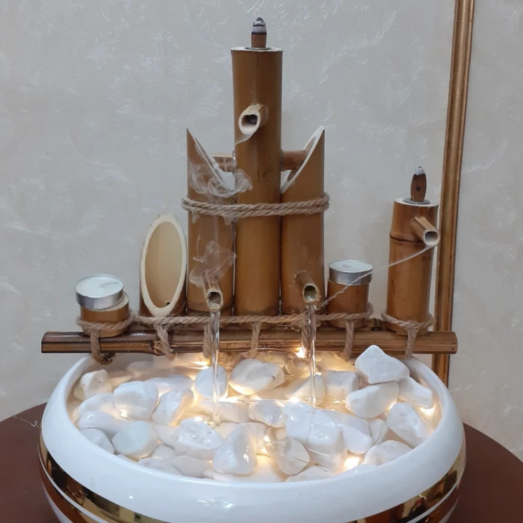 متخصص در تولید آبنما رومیزی دارای پمپ آب با کیفیت دارای نور کاملا ضدآب دارای سنگریزه دارای جا شمعی دارای جا عودی ابشاری یا کله قندی قطر ظرف ۳۰سانت جنس ظرف سرامیکی چوب بامبو بهترین و مناسب ترین هدیه