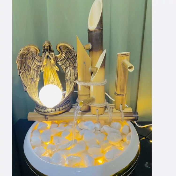 قابلیت جابجایی داره و نیازی به لوله کشی اب نداره و دارای نور و سنگ نمک نور دار و مجسمه فرشته و ساختار بامبویی و سنگ داخل کار با یه بطری اب داخل ظرف رو پر اب کنید به برق بزنید شروع به کار میکنه و برق نور و پمپ اب و سنگ نمک جداست و میتونید به عنوان شب خواب ازش استفاده کنید