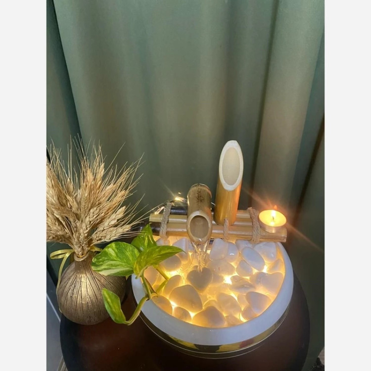 دارای پمپ اب با کیفیت و دایمی دارای نور دارای سنگریزه قطر ظرف 22سانت کارها فیکس هستند بهترین دکوری و هدیه است مناسب سالن زیبایی ماساژ