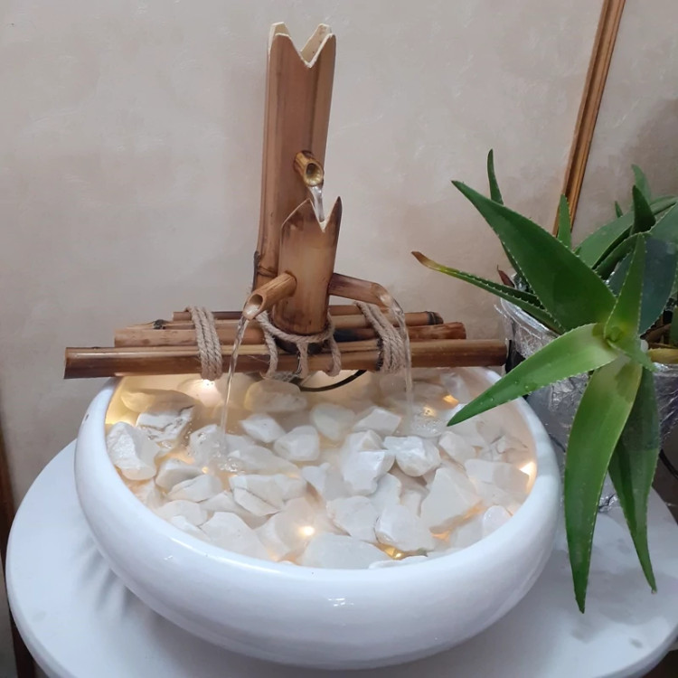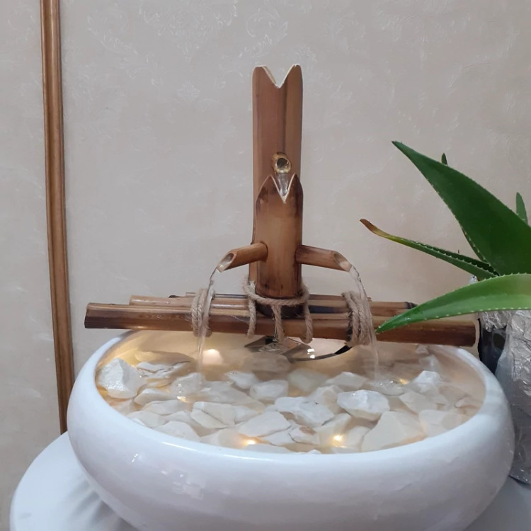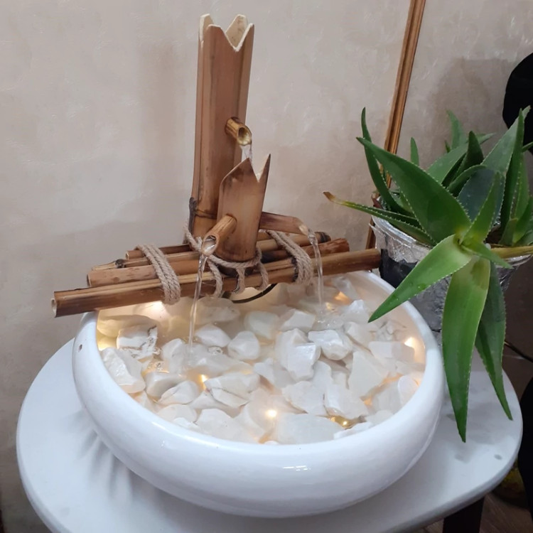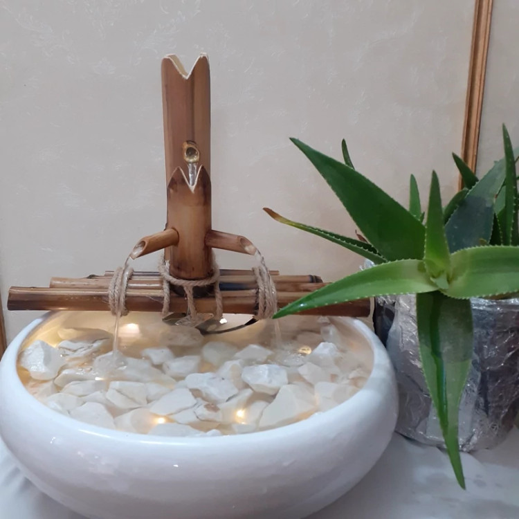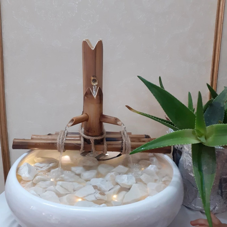 تولید کننده آبنما رومیزی بامبو.دارای پمپ آب بیصدا.دارای سنگ داخل کار مرمر سفید طبیعی.دارای نور.قطر ظرف ۳۰ سانت