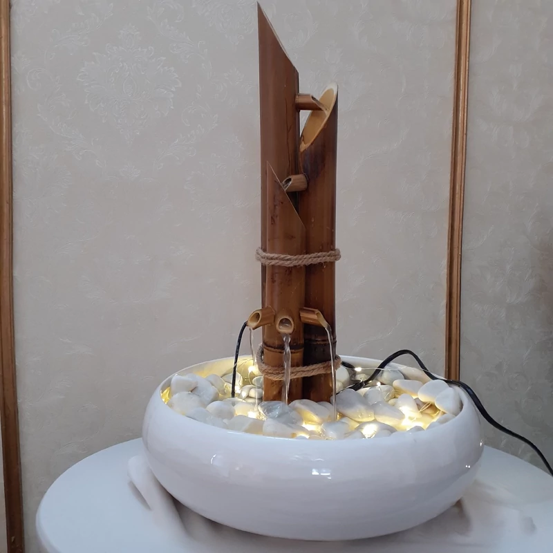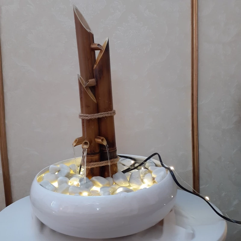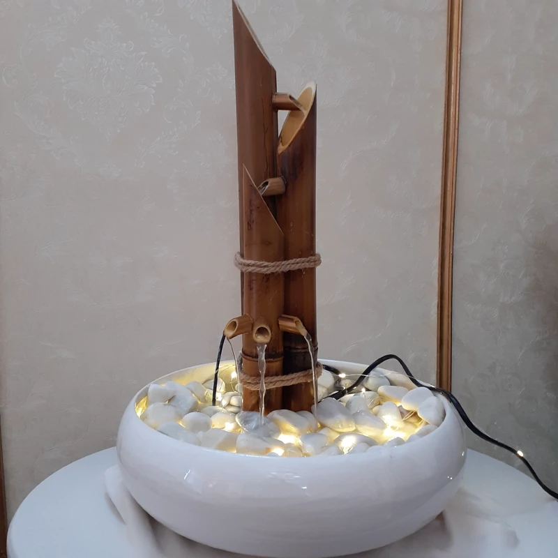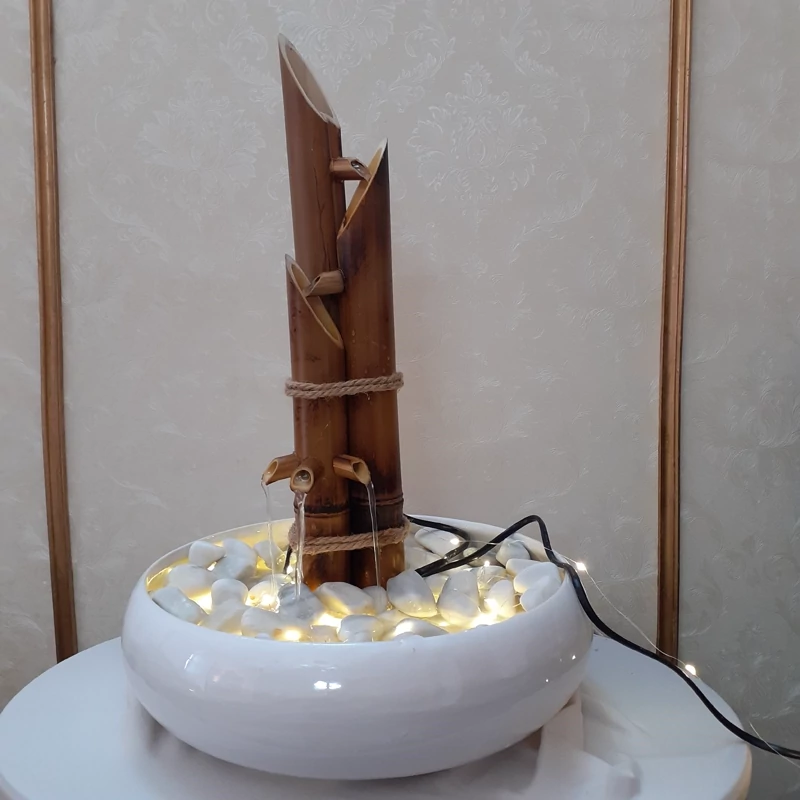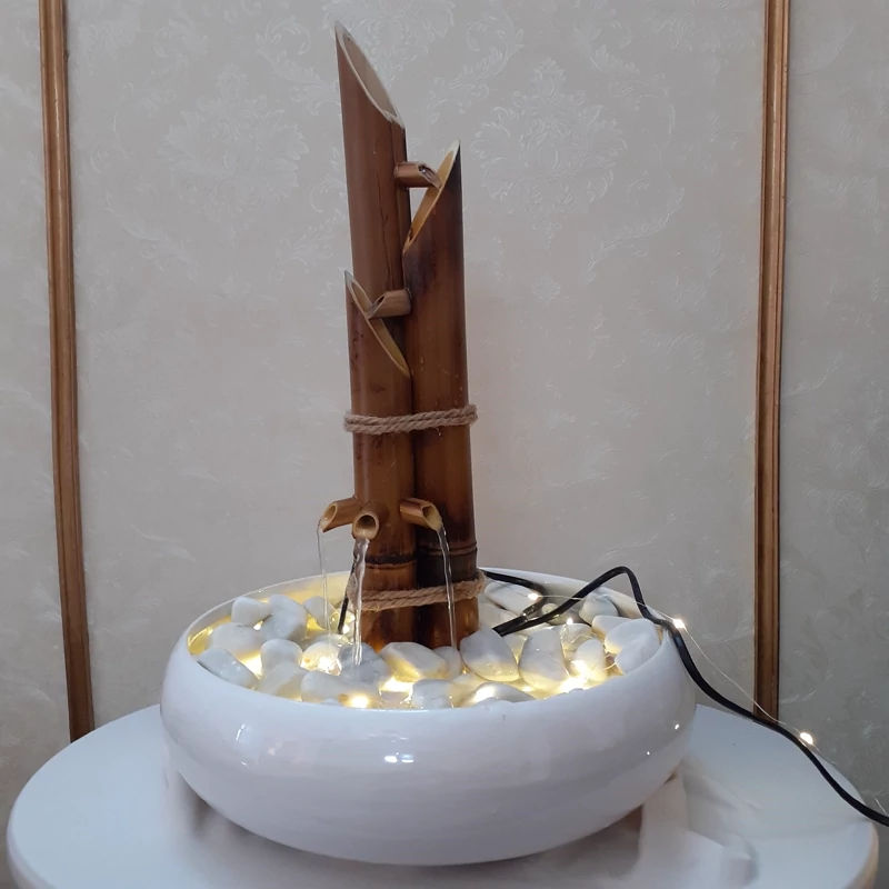 تولیدکننده آبنما رومیزی دارای پمپ آب بیصدا دارای نور کاملا ضدآب دارای سنگ داخل مرمر سفید طبیعی احتیاجی به لوله کشی آب ندارد.
